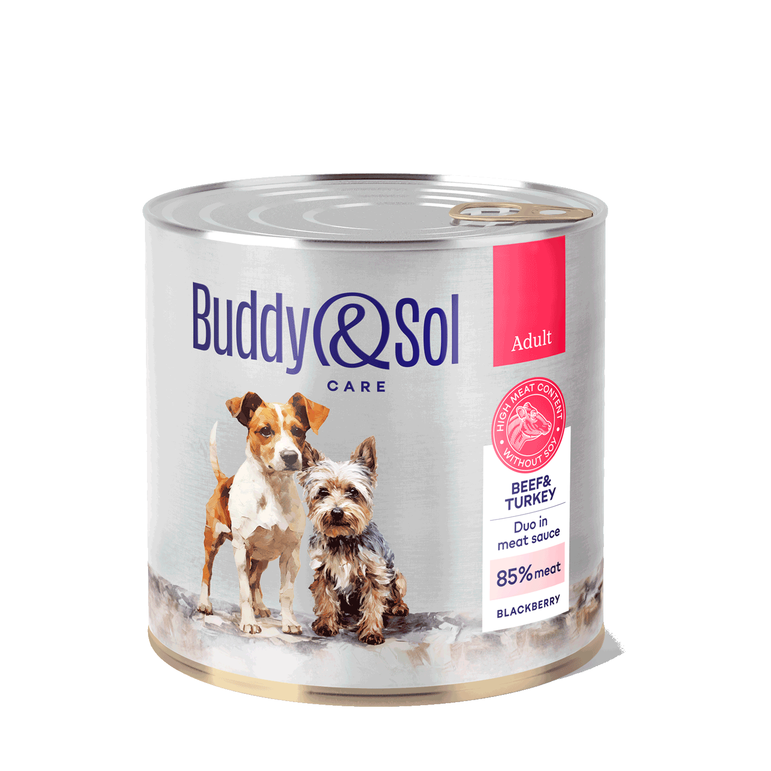 85% - мясо говядины, мясо и волокна индейки, субпродукты (печень индейки, говяжье легкое, говяжий желудок); мясной бульон, злаки, аминокислоты, ежевика, витаминно-минеральный комплекс.